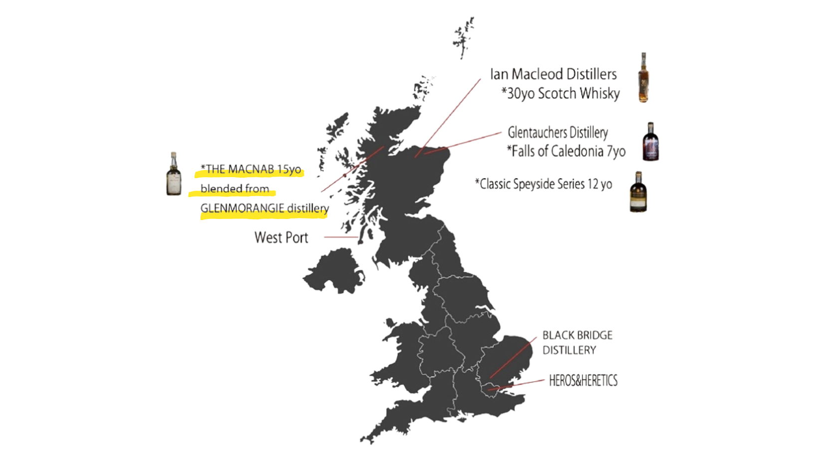 「THE MACNAB 15 YEAR OLD BLENDED FROM GLENMORANGIE DISTILLERY」は現地のボトラーズ会社(Heroes & Heretics Ltd )が独自の流通網で可能にできたウェストポートブレンドモルトスコッチウイスキーです。当社は、このH&H社と提携することで当商品を日本で初めて発売することができました。