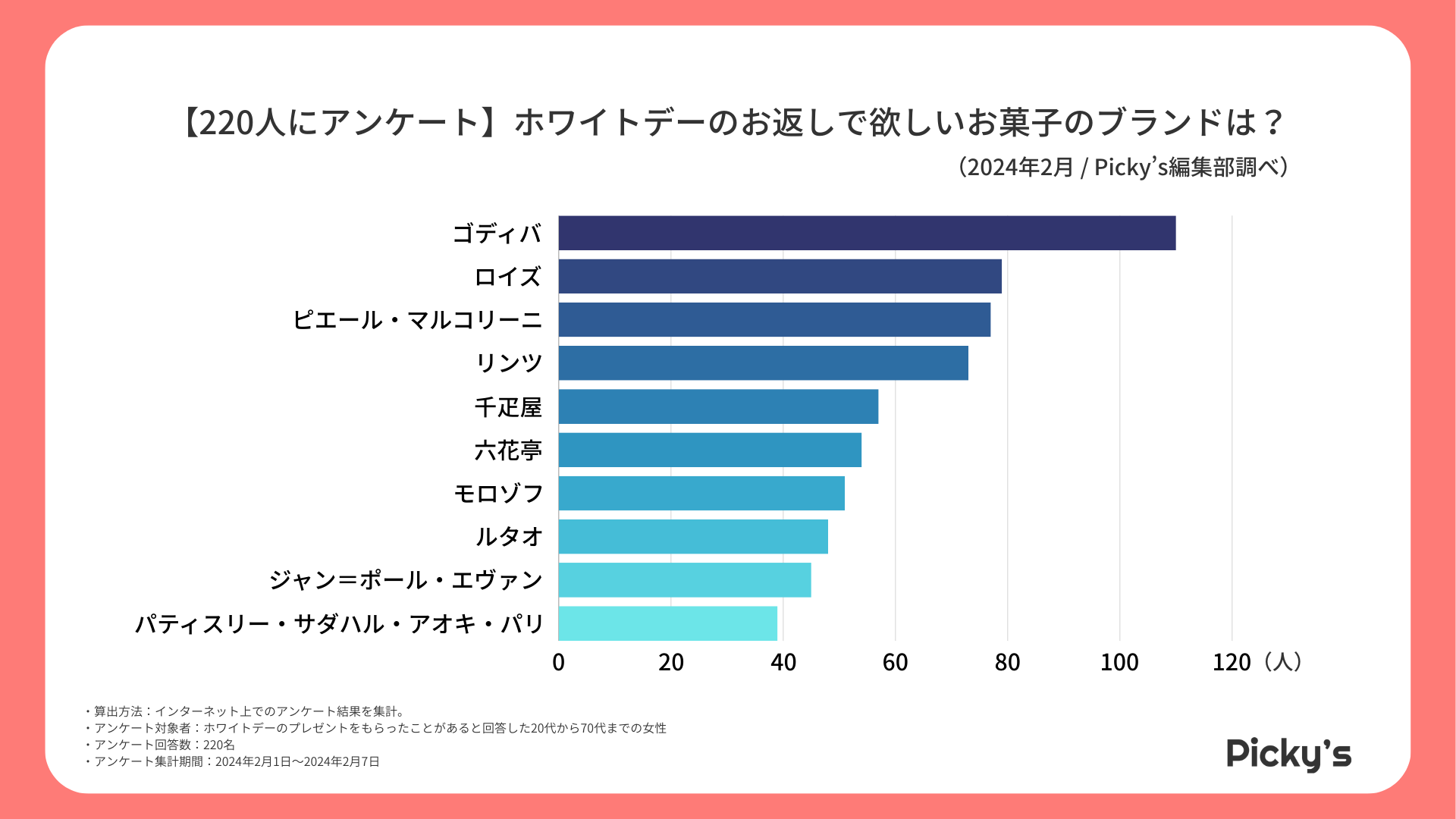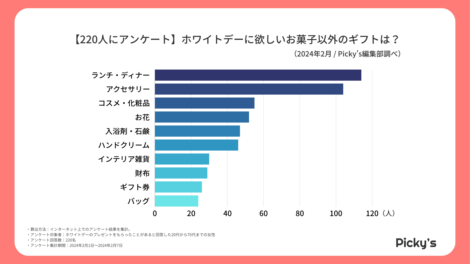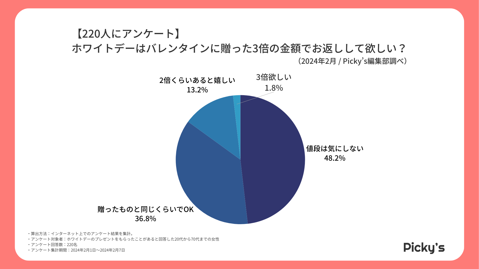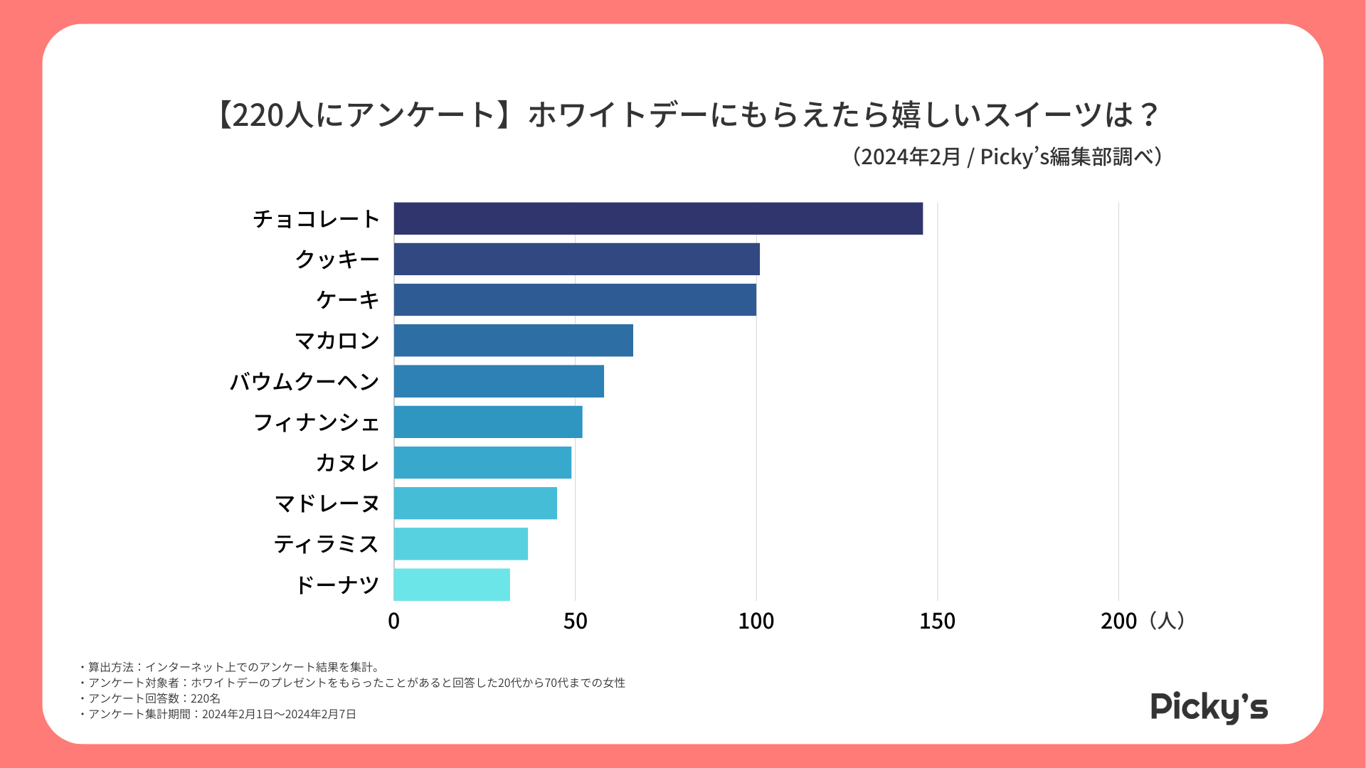 「Picky’s」は、インターネットショッピングにおいて、購入前に試せない・選ぶべきものがわからないという課題の解決を目標に、あらゆる商品のおすすめランキングや検証レビューを紹介するサイトです。このたびPicky’s(https://rentry.jp/)では、2024年3月14日ホワイトデーに先駆けて、ホワイトデーについてインターネット上でアンケート調査を行いましたので発表いたします。