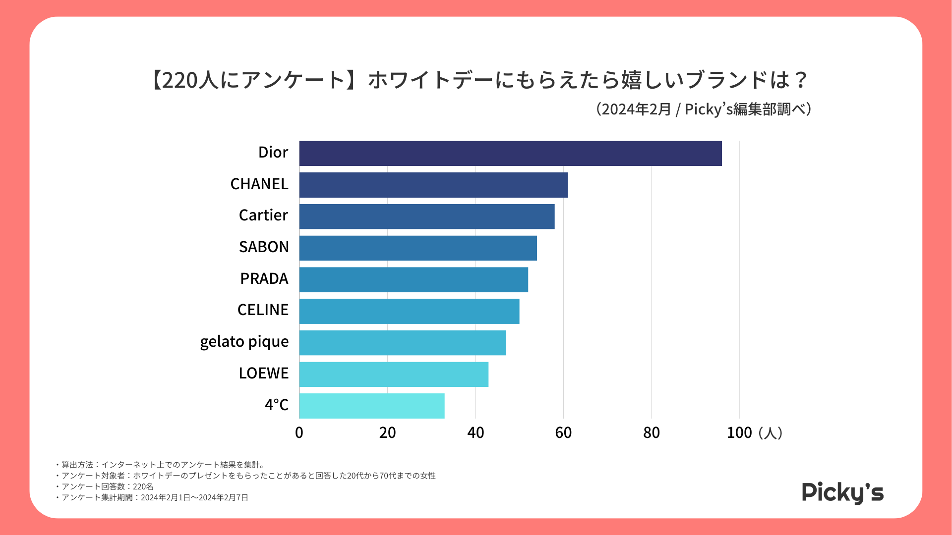 ホワイトデーにもらえたら嬉しいとされたブランド1位は「Dior」で、そのエレガントでラグジュアリーなデザインが多くの女性を引きつけています。次いで、「CHANEL」や「Cartier」も高い評価を受けており、これらのブランドは時計やアクセサリーなど、贈り手の洗練された品味と気配りを象徴しています。4位の「SABON」は、高品質なスキンケア製品や香り豊かなアイテムで知られており、日常のリラックスタイムを演出するギフトとして人気です。「PRADA」や「CELINE」、「LOEWE」は、ファッションアイテムにおいて高いクオリティと洗練されたスタイルが特徴で、これらのブランドからの贈り物は女性の心を掴むでしょう。また、7位の「gelato pique」は、リラックスウェアのブランドとして広く親しまれています。特に、贈り物が心地よいくつろぎを提供できるものであることが、女性たちにとって重要視されていることが分かります。最後に、「4°C」は日常的に身につけやすく、贈られたら嬉しいと感じることが伺えます。