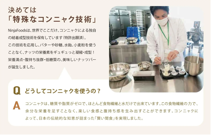 通常、ナッツやグラノーラなどを固めるには、砂糖・水あめ・小麦粉・バター・チョコレート(ココアバター)を用いますが、これらの代わりに独自の液体蒟蒻素材を使用することで、糖質や脂質などの余分な栄養や甘みを添加することなく、ナッツそのものの味と栄養を活かし、新しい食感のみを付与したスナックの開発に成功しました。