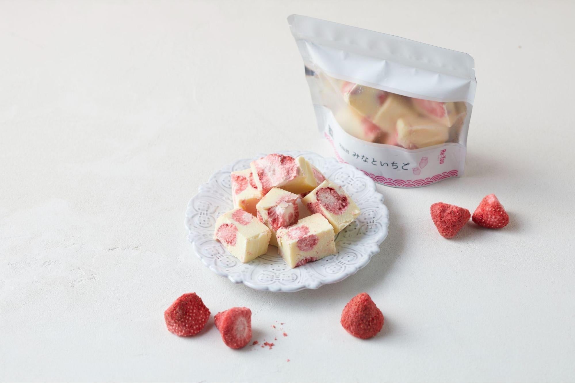 「Re:You気仙沼みなといちご」は規格外のいちごをフリーズドライ化し、未利用で上質素材のホワイトチョコレートと合わせブロック状にすることで,いちごの形をポジティブに活かしたメッセージ性のある商品となっています。