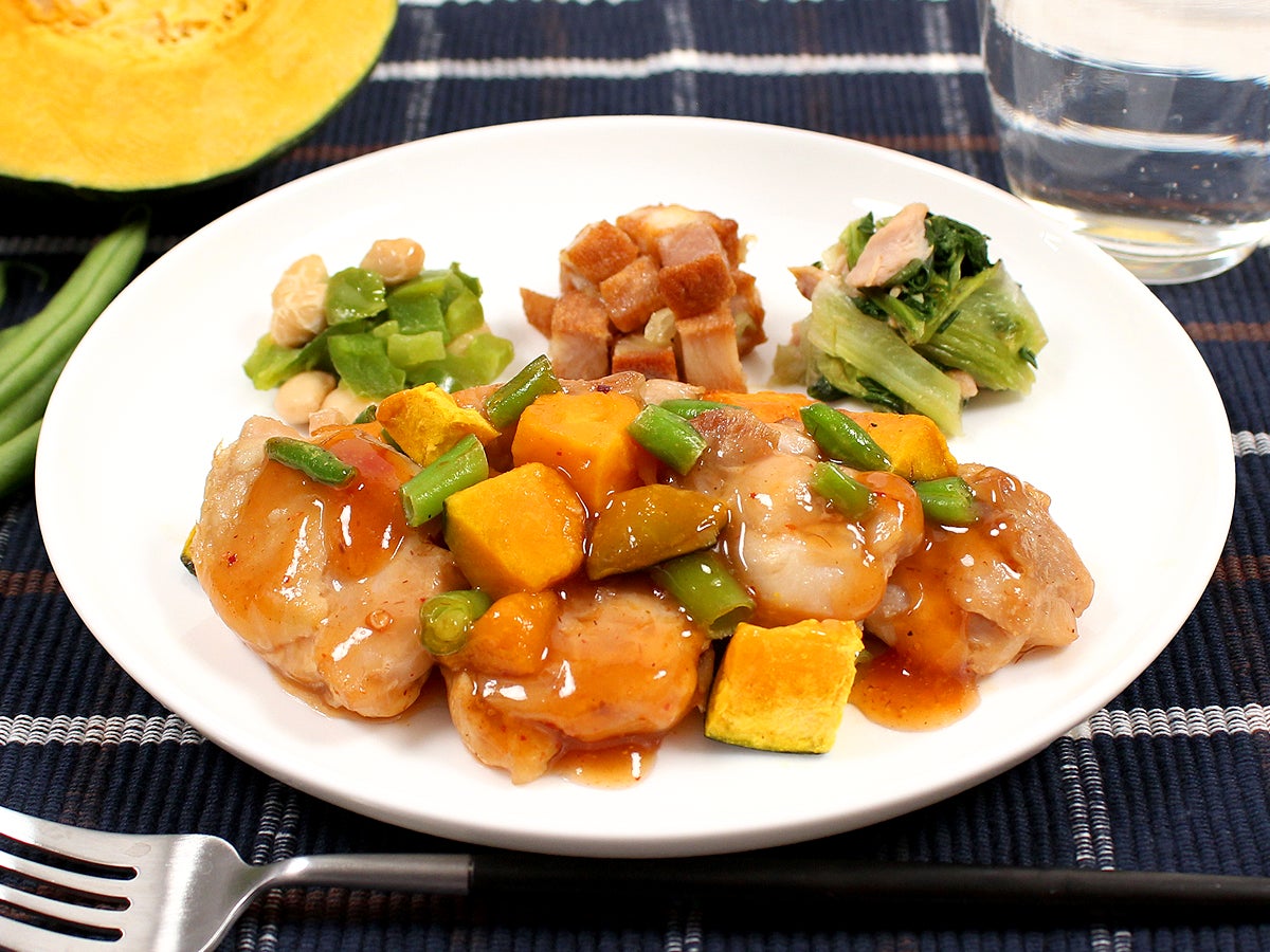 副菜は、ピーマンと大豆のサラダ、葱チャーシュー、青梗菜とツナのあえ物です。