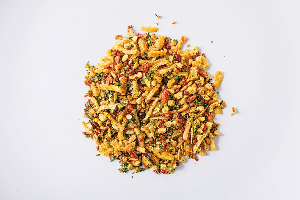 大粒のフライドオニオンとローストアーモンドがザクザ クとした食感を生み出し、料理の中での存在感が際立つトッピング 用スパイスです。フライドオニオンやローストガーリックの香ばしさ、ディルの華やかな香り、そして梅の酸味による複雑で豊かな味わいが、新たなスパイス体験を演出します。