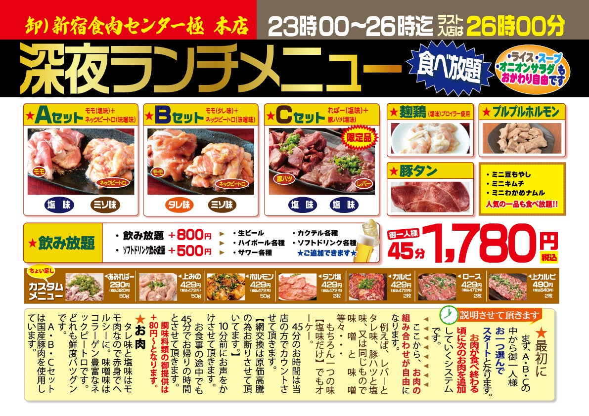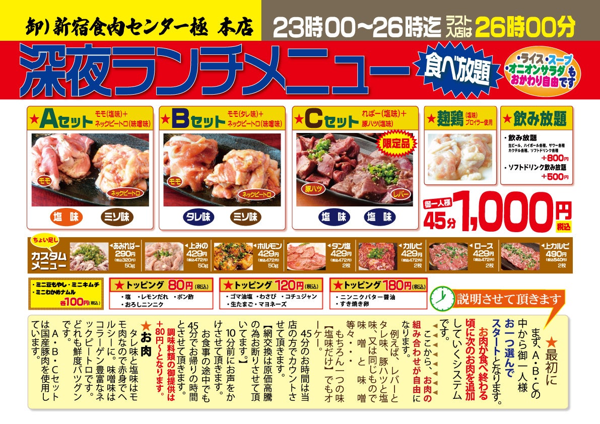 連日行列のできる45分の焼肉食べ放題【深夜ランチ】がリニューアル!通常の食べ放題に加え、ボリュームアップした新プランとアルコール・ソフトドリンクの飲み放題もお付けする事が出来ます!