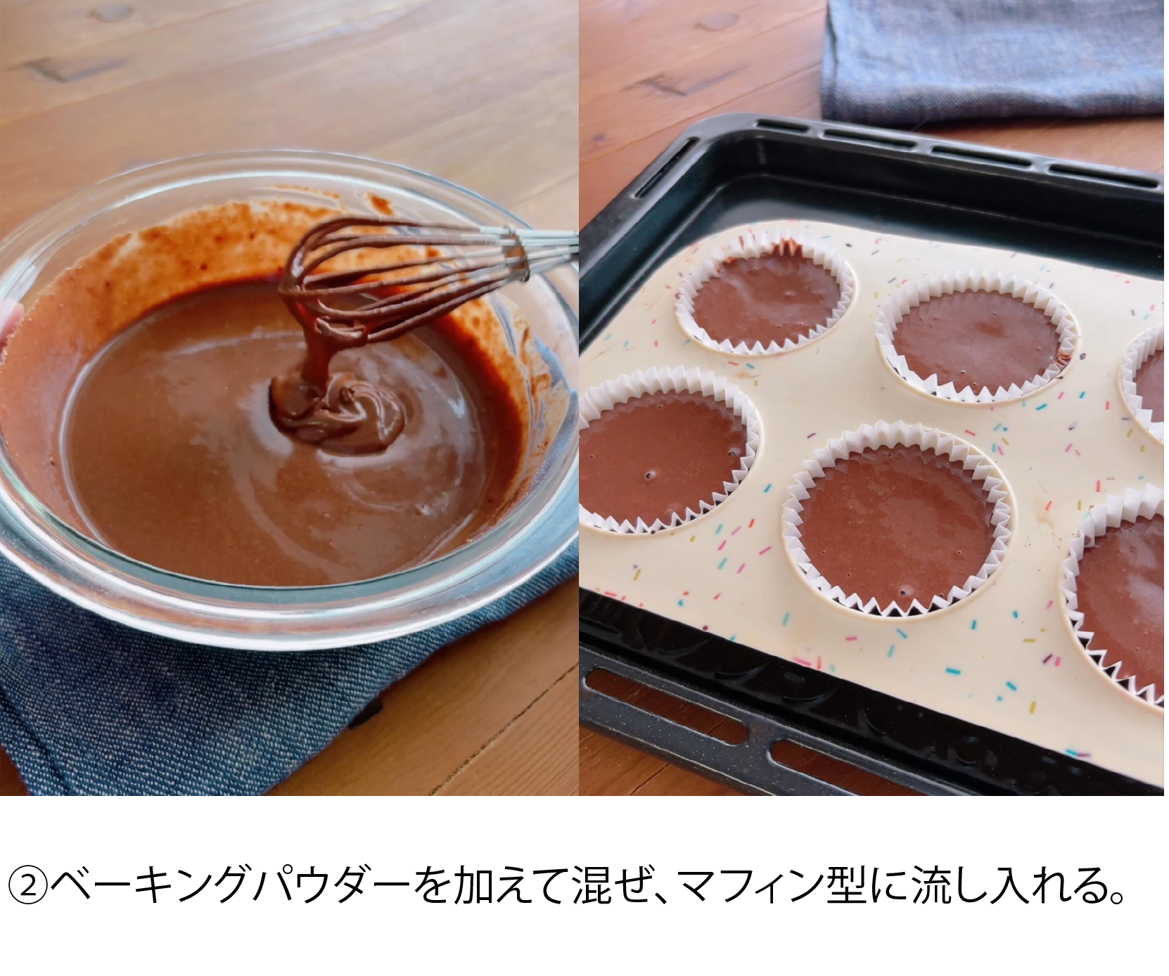 ②ベーキングパウダーを加えて混ぜ、マフィン型に流し入れる。