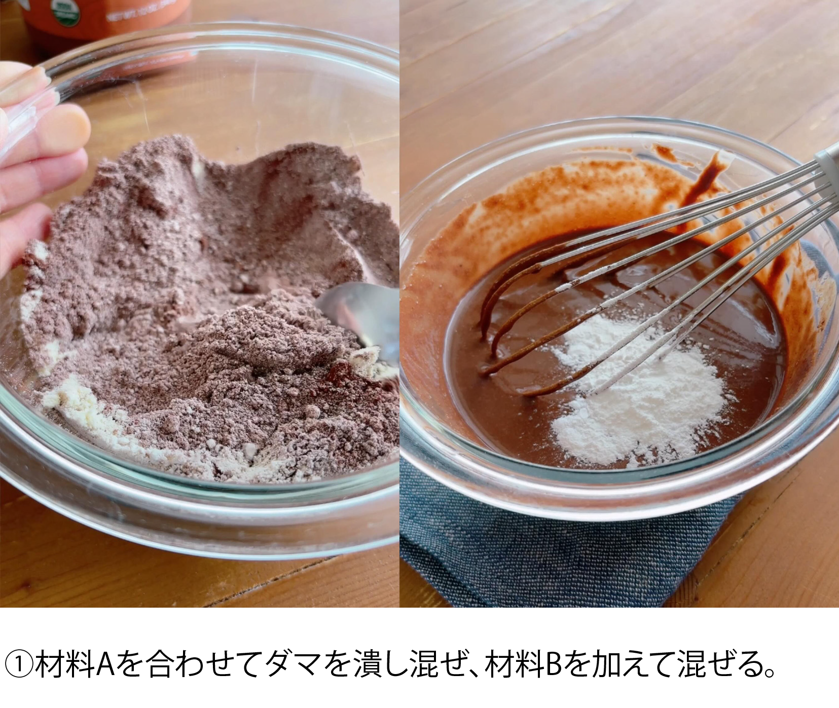 ①材料Aを合わせてダマを潰し混ぜ、材料Bを加えて混ぜる。