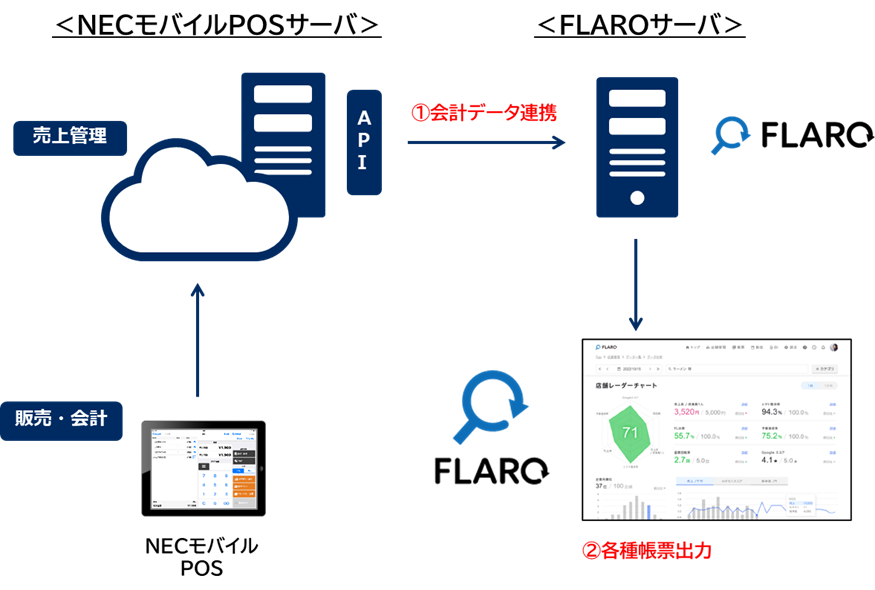 今回の連携により、NECモバイルPOSクラウドサーバからFLAROサーバへ自動で売上データが取りこむことができるようになりました。