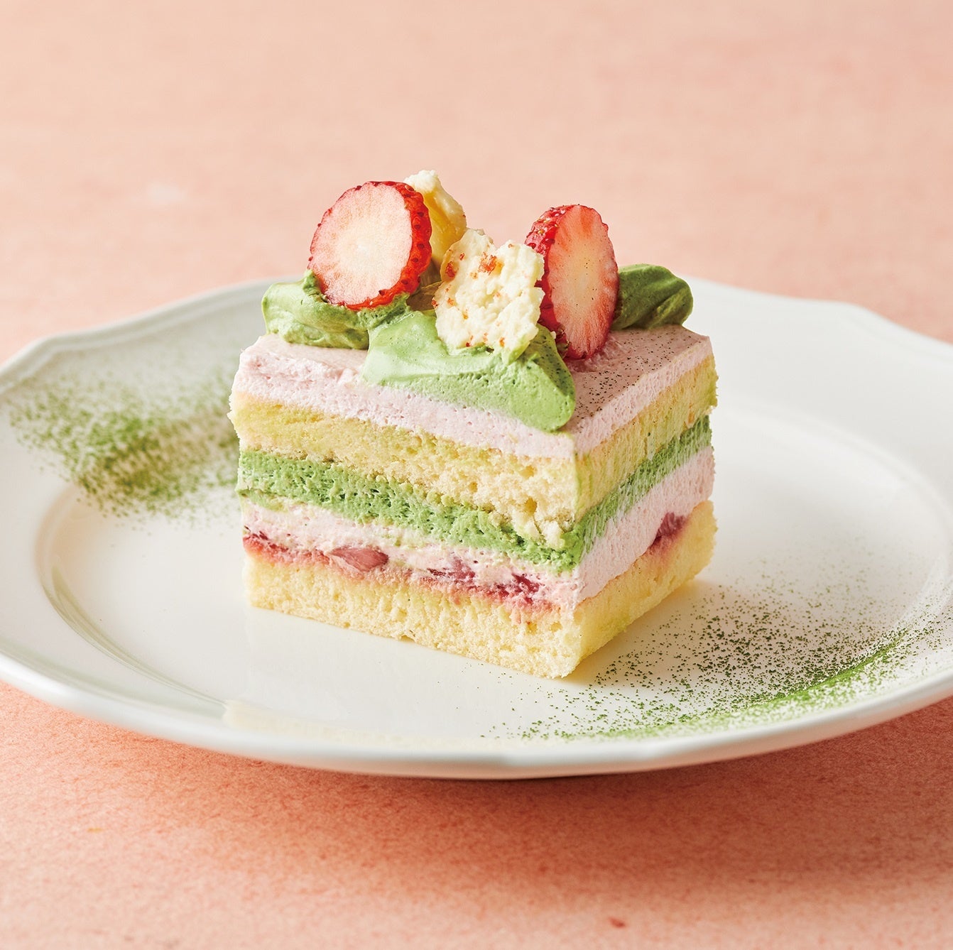口溶けのよいホワイトチョコレート入りの抹茶ホイップとストロベリーホイップを交互に重ねました。ホワイトチョコとストロベリーのクランチをトッピング。