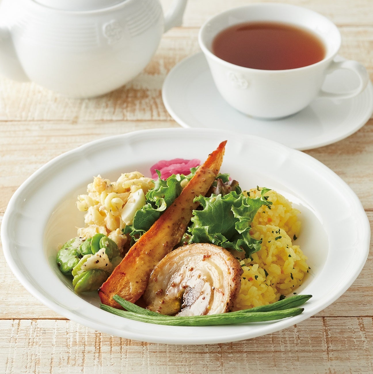 ローズマリーやタイムをまぶして焼き上げたポルケッタ(ローストポーク)、3種のデリ(レッドキャベツと甘夏のラぺ、そら豆のパルメザンチーズ焼き、卵とディルのショートパスタサラダ)、クミンでマリネして焼き上げた人参、インゲンなどをバターライスとともにワンプレートにしました。