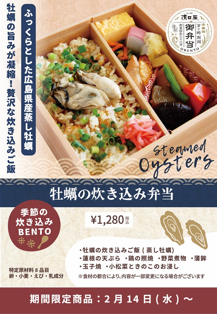 まん福ホールディングスグループのちがさき濱田屋(株式会社浜田屋 本社:神奈川県茅ヶ崎市、代表取締役社長:下田彰彦、以下 「濱田屋」)では「牡蠣の炊き込み弁当」を2月14日(水)より全店舗(都筑阪急店は除く)にて新発売いたします。牡蠣の旨み凝縮!広島県産のふっくらとした蒸し牡蠣を添えた贅沢な牡蠣の炊き込みご飯のお弁当です。数量限定発売ですので、事前の予約をおすすめいたします。