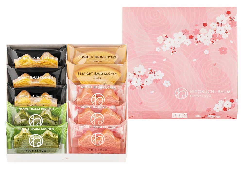 上質な味わいはそのままに、上品なひとくちサイズでねんりん家の世界を満喫していただける、春のお詰合せもご用意しております。芳醇なバター風味がたまらない代表作「マウントバーム しっかり芽」に春限定「桜の国のマウントバーム」、芳醇宇治抹茶香る「マウントバーム お抹茶」、たまごたっぷりにふっくら焼きあげた「ストレートバーム やわらか芽」。4種の味わいを一度にお楽しみいただけます。愛らしい桜模様の包装紙も春爛漫の気分を盛り上げます。ご自宅用はもちろん、卒業・入学などの門出をお祝いする贈り物としてもぴったりの装いです。
