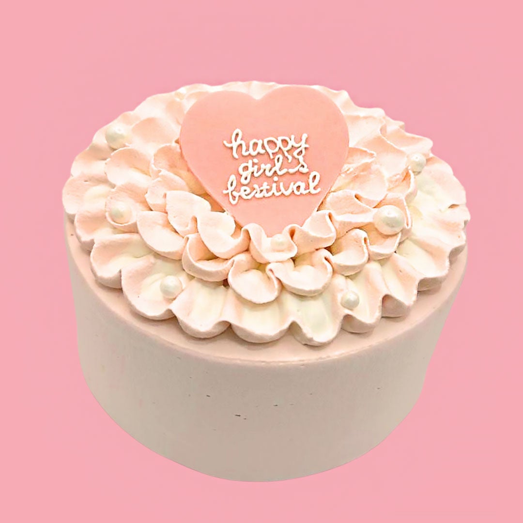 桃の節句にちなみ、桃の花をイメージした立体的なフリルのクリームはまるでお姫様のドレスのよう。パールをちりばめることによりかわいらしさの中に上品さがあるデザインに仕上がりました。