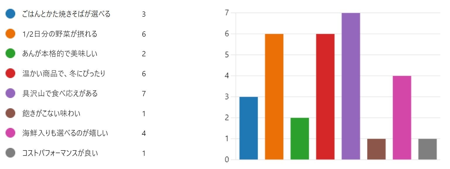 最も多くの票を集めたのは『具沢山で食べ応えがある』というポイントでした。以下2位は『1/2日分の野菜が摂れる』、『温かい商品で、冬にぴったり』でした。