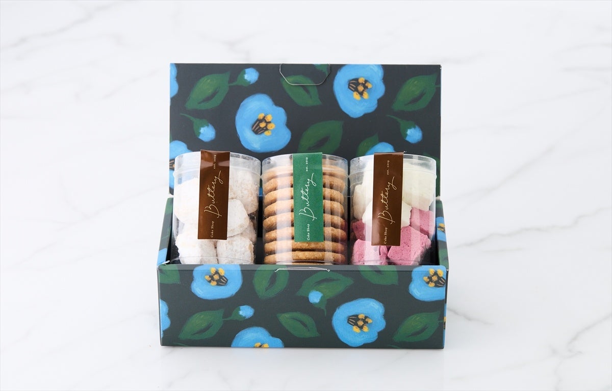 2月15日(木)~3月14日(木)の期間限定販売となる『ホワイトデー限定ギフトアソート~joie~』には、Butteryの新作スイーツを贅沢にアソート。しっとりなめらか、ふわふわ食感の「ギモーヴ」は、青りんごとベリーのピューレをあわせて爽やかに仕上げました。華やかなピンクと淡いイエローを組み合わせた可愛いギモーヴは、春の贈り物にもぴったりです。また、ローストした香ばしいくるみとメープルシロップ、北海道バターを使った新作の「くるみとメープルのクッキー」も新登場!さらに、ほろほろとした食感が人気の「ブールドネージュ」も加え、ホワイトデーにふさわしい特別な1箱が完成しました。青い花をモチーフにした、レトロなギフトボックスも魅力です。