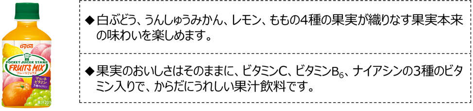 「ポケットジューサースタンド フルーツミックス」は、白ぶどう、うんしゅうみかん、レモン、ももの4種の果実が織りなす果実本来の味わいを楽しめます。また、果実のおいしさはそのままに、3種のビタミン※入りで、からだにうれしい果汁飲料です。
