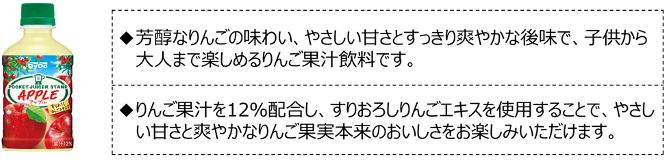 「ポケットジューサースタンド アップル」は、りんご果汁とすりおろしりんごエキスを使用し、芳醇なりんごの味わいで、やさしい甘さとすっきりとした爽やかな後味です。