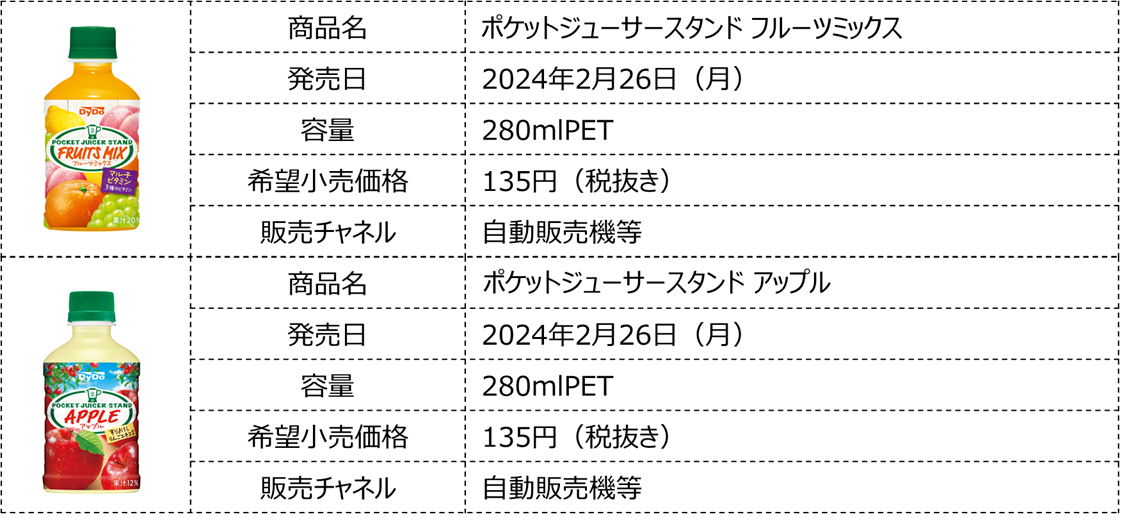 ダイドードリンコ株式会社(本社:大阪市北区、代表取締役社長:中島 孝徳)は、2024年春夏の新商品として、「ポケットジューサースタンド フルーツミックス」「ポケットジューサースタンド アップル」を2月26日(月)より発売いたします。