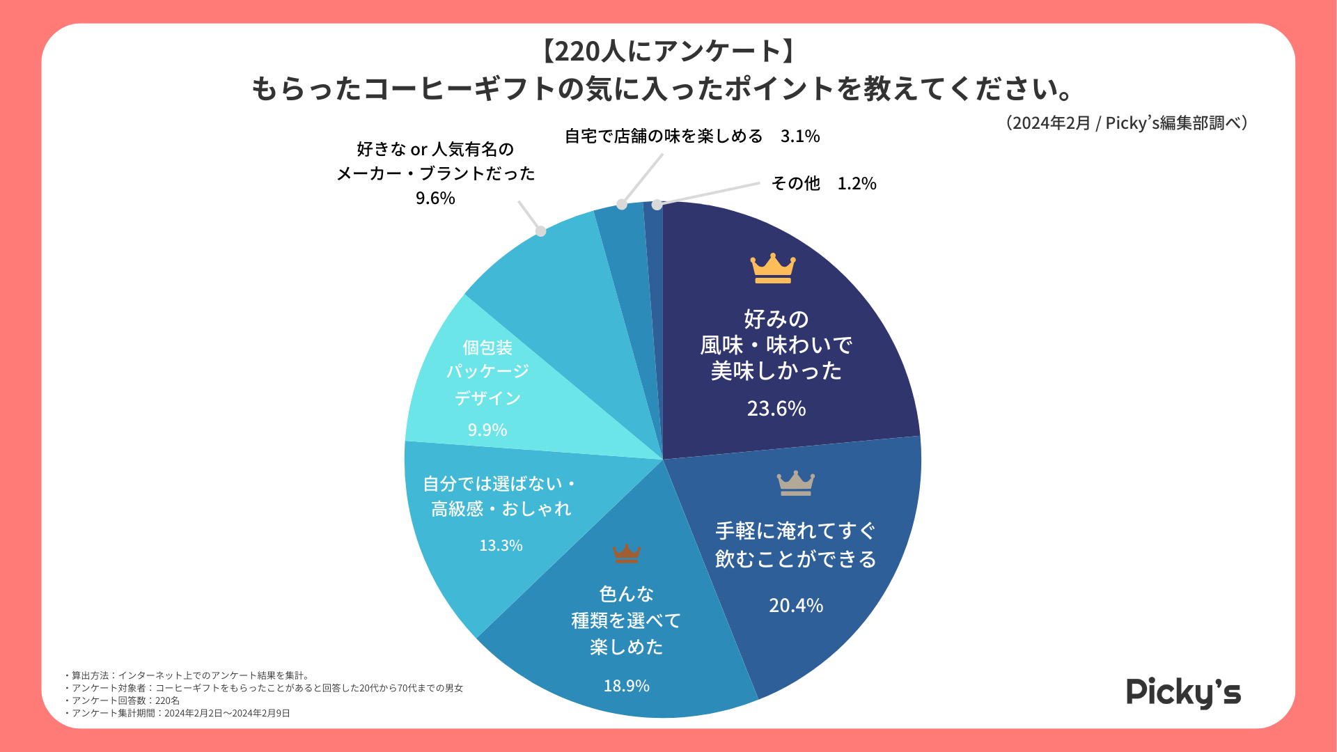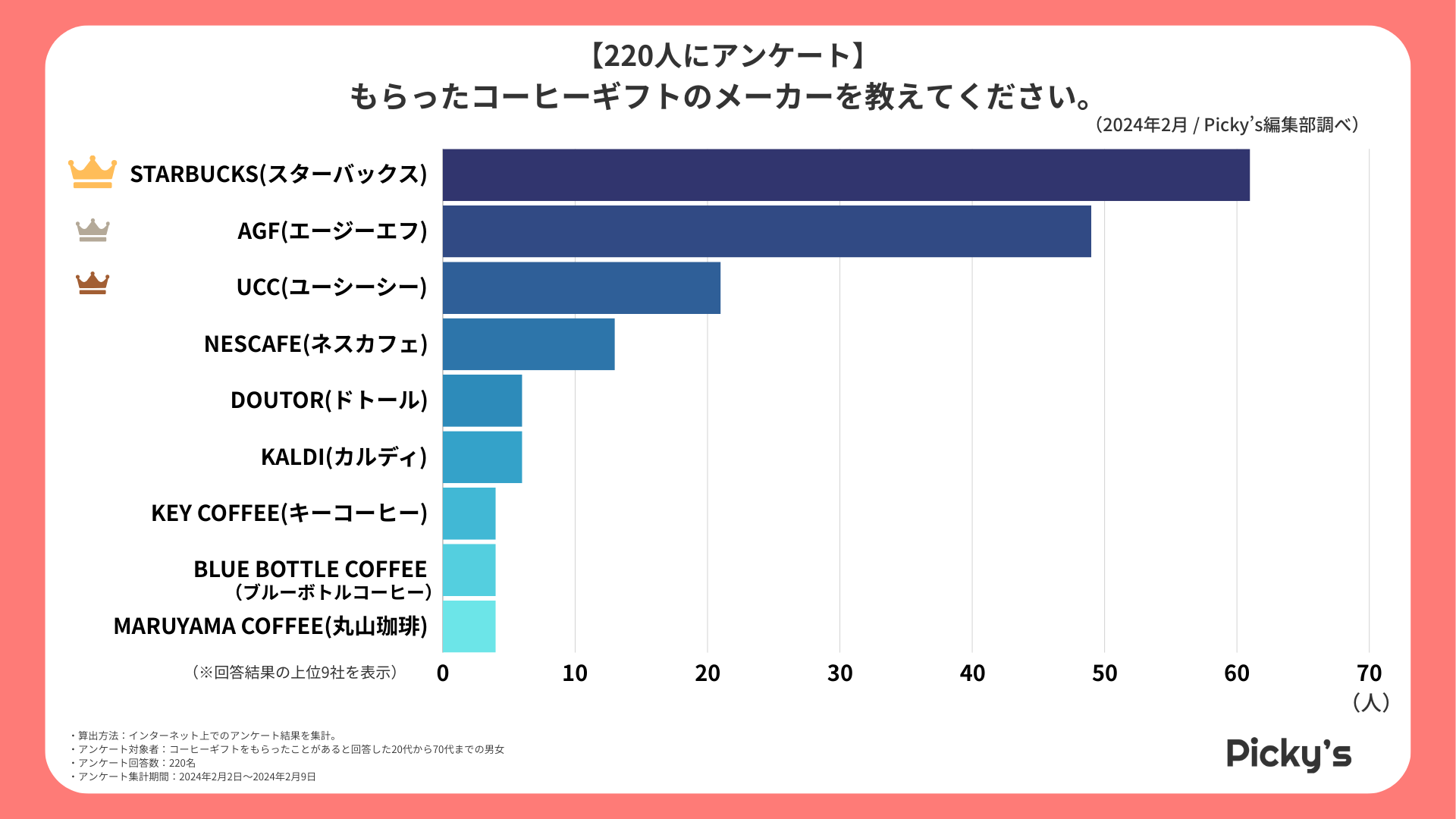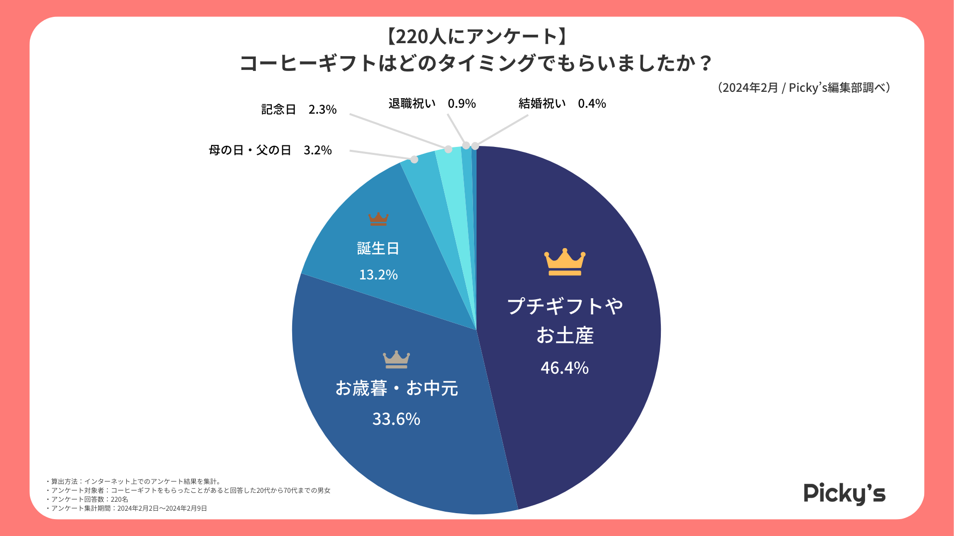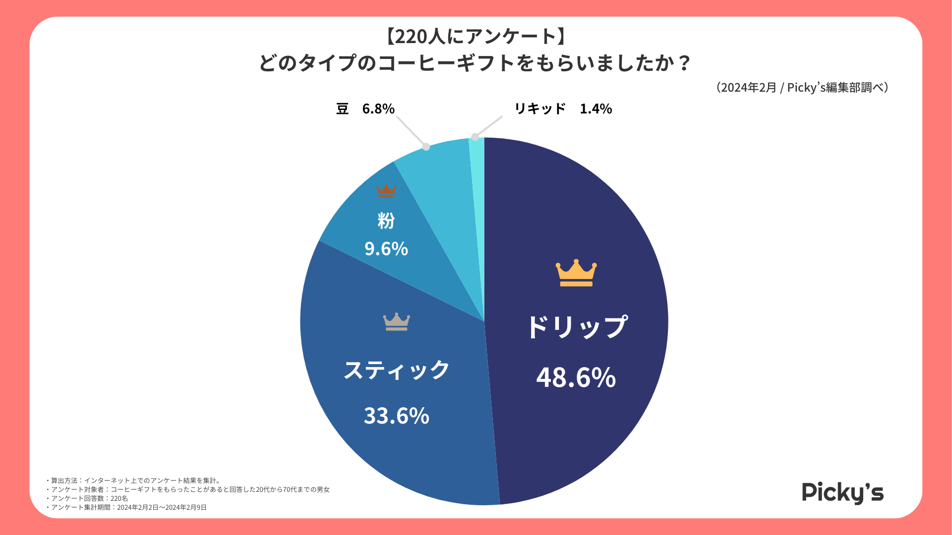 「Picky’s」は、インターネットショッピングにおいて、購入前に試せない・選ぶべきものがわからないという課題の解決を目標に、あらゆる商品のおすすめランキングや検証レビューを紹介するサイトです。このたびPicky’s(https://rentry.jp/)では、ギフト関連に先駆けて、今までどんなコーヒーギフトをもらったことがあるのか、インターネット上でアンケート調査を行いましたので発表いたします。