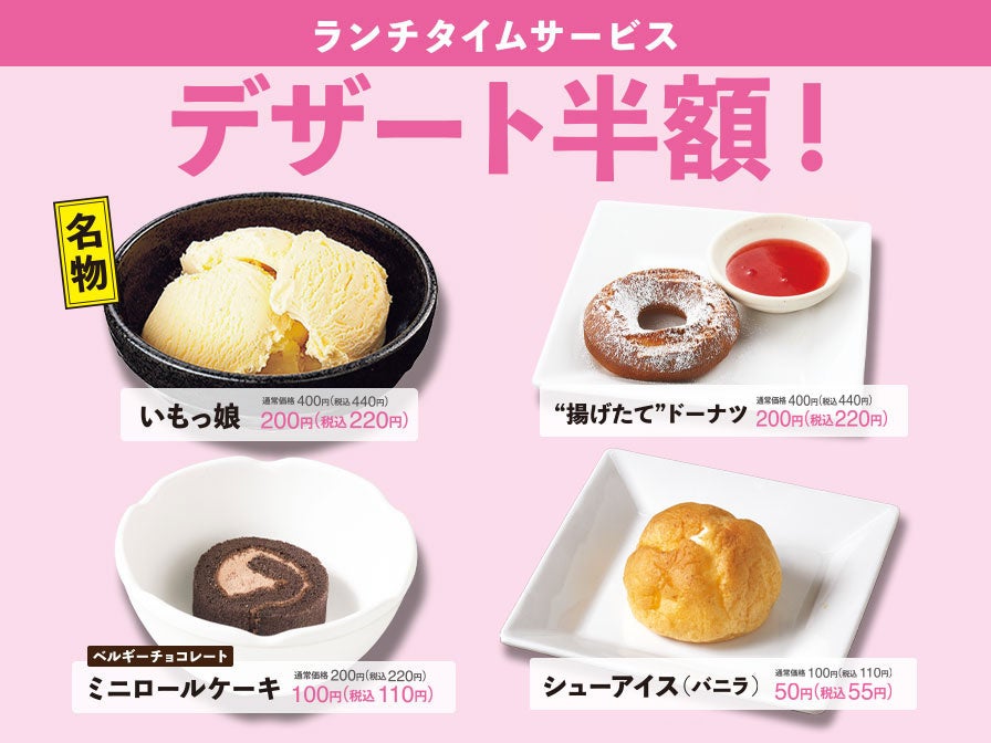 デザート全品半額です。50円(税込55円)からございます。
