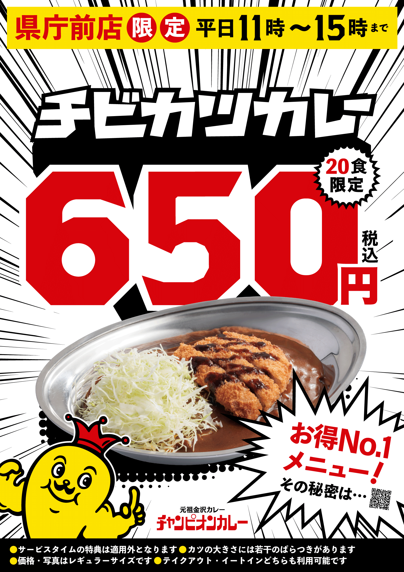 チャンピオンカレーの看板メニュー「Lカツカレー」は大きさやサイズが一定になるように設定されています。そのためLカツを製造する過程でトリミングされた端材がロスとなっていました、異なるのはサイズのみで、味と品質はLカツと同じ。フードロスの観点で製造工程を見直し、商品化を目指してまいりました。その結果、端材活用のため多少サイズが不揃いではあるものの、その分コストを抑え、皆さまにご満足いただける商品をご提供できる体制が整いました。チャンカレファンの皆さまには日頃のご愛顧に感謝の気持ちで、またチャンカレ「初めまして」の皆さまには、これを機にチャンカレの味をお試しいただきたい!そんな思いを込めて、平日11時~15時、数量限定ではございますが、販売価格を抑えて提供します。美味しくお手頃価格で、さらにフードロス削減にもつながる、「チビカツカレー」を是非お試しください。