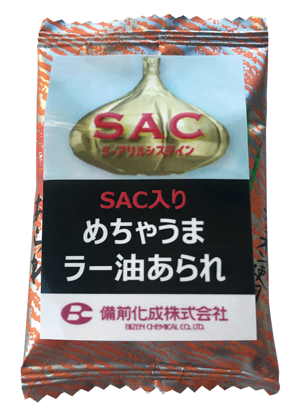にんにくラー油味のあられに「SACニンニク」の粉末をまぶした一品。ぜひ、ご賞味ください。