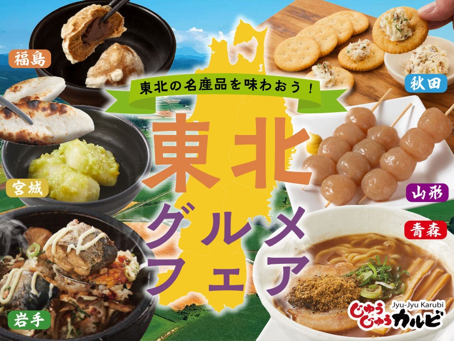 「東北グルメフェア」は、「大感激コース」「じゅうカルコース」「国産牛&みすじコース」「牛タン&黒毛和牛コース」「学生限定コース」をご注文の方が食べ放題です。この機会にじゅうじゅうカルビで東北グルメをご堪能ください。