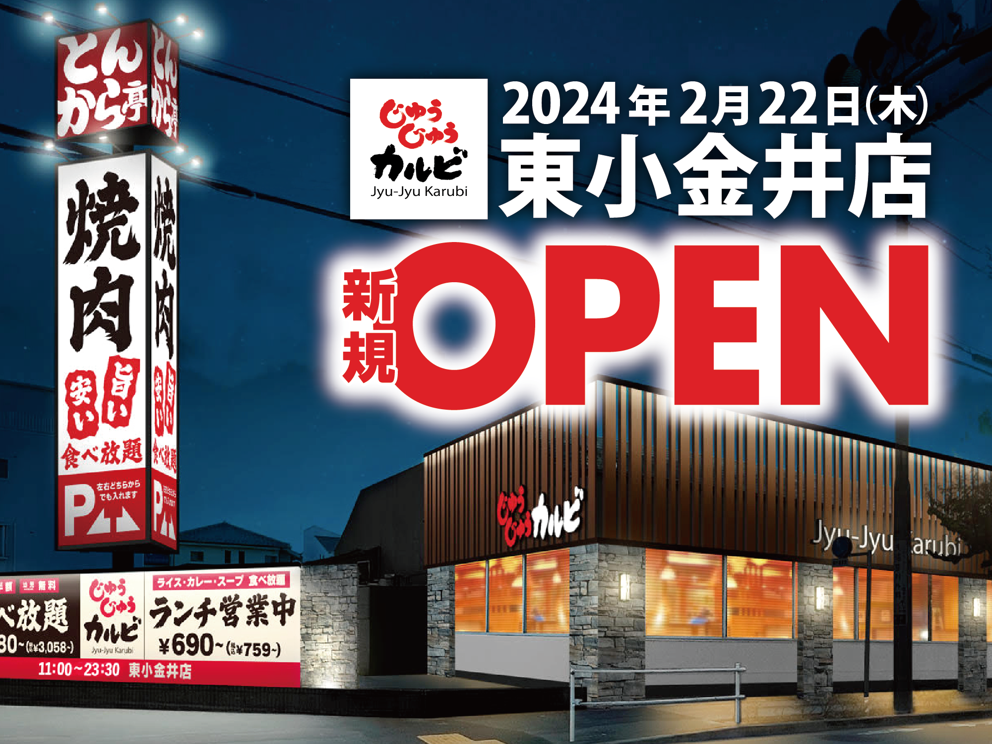 2024年は関東圏を中心に店舗数拡大を予定しており、1店舗目となる「じゅうじゅうカルビ東小金井店」がJR中央線 東小金井駅から徒歩8分の好立地に店舗を構えます。