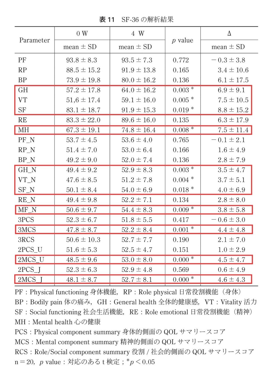 健康関連QOL調査では、GH、VT、SF、MH、GH_N、VT_N、SF_N、MF_N、3MCS、2MCS_U、2MCS_Jが摂取後4週で開始時(0週)に比べて有意に高い値を示しました。また4週間の試験品の摂取期間中に”重篤な有害事象”の発生は認められず、試験期間中に認められた有害事象は20症例中1例3件。すべての有害事象において研究責任者より研究食品との因果関係は関連なしと判定され、副作用は0件でした。
