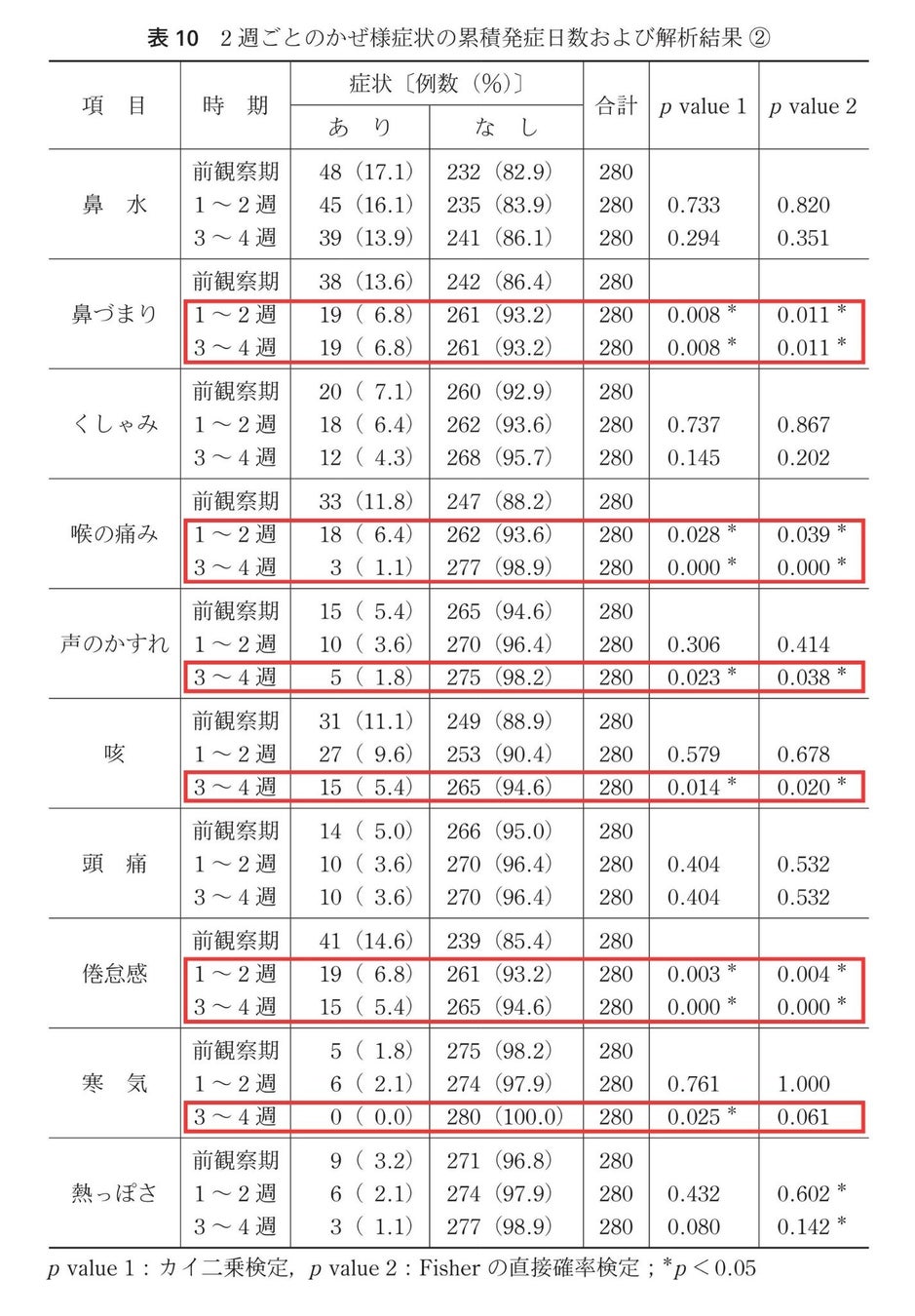 被験者20人に対する体調アンケートでは、鼻づまり、喉の痛み、倦怠感が1~2週、3~4週で前観察期に比べて発症が有意に減少しました。また声のかすれ、咳、寒気では3~4週で前観察期に比べ発症が有意に減少しました。
