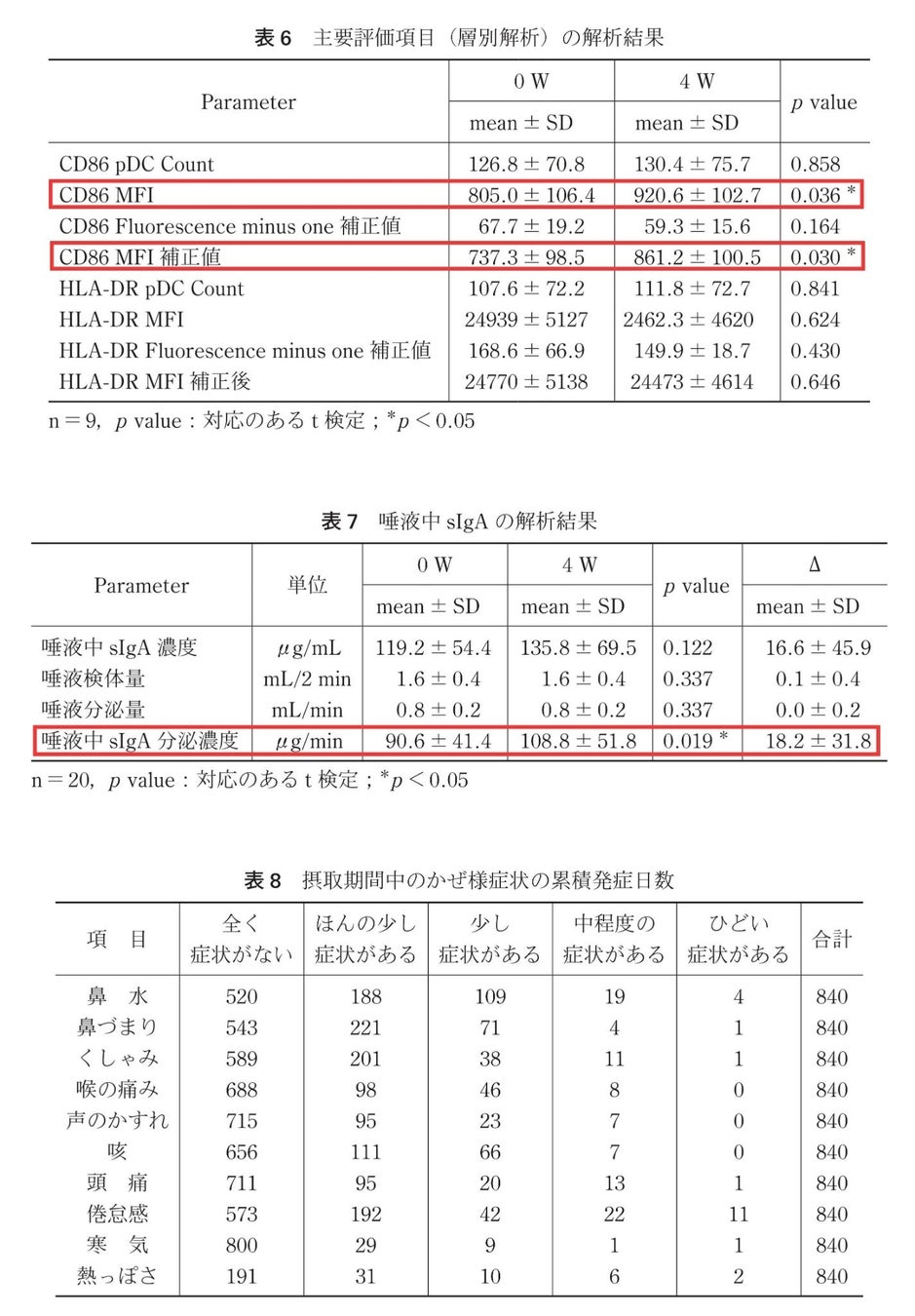 主要評価項目である免疫細胞のpDC活性評価の層別解析では、CD86MFI、CD86MFI補正後の数値が摂取後4週で摂取開始時(0週)と比べて有意に高い変化を示しました。