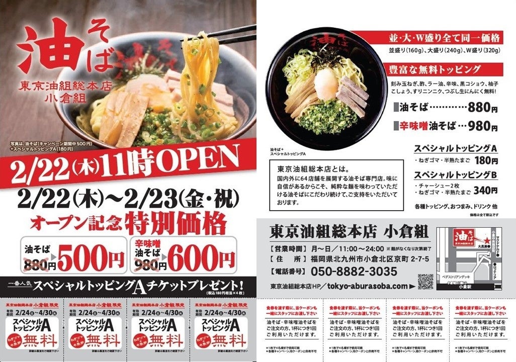 今回、北九州市初出店を記念し、2024年2月22日(木)、23日(金・祝) 2日間、「油そば」 500円(税込)、「辛味噌油そば」 600円(税込)でお召し上がりいただける、“オープン記念キャンペーン” を実施いたします!※並盛り・大盛り・W盛り全て同一価格(東京油組総本店 小倉組のみで実施)