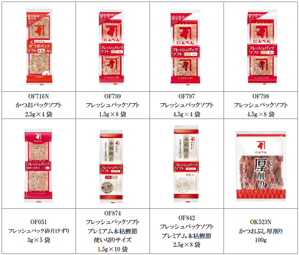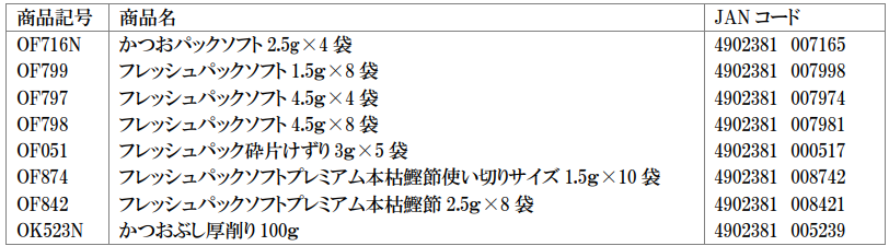 既に百貨店商品の一部では先行して賞味期間延長を実施しておりますが、この度家庭用の主力商品を含むかつおパック類7品と、削り節類1品に賞味期間延長の適用範囲を拡大します。