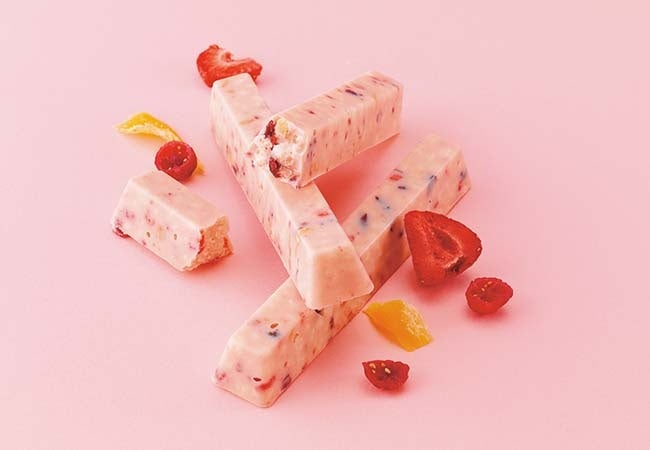 ストロベリーとバナナのパウダーを練り込んだホワイトチョコレートに、ドライフルーツのマンゴーとクランベリー、フリーズドライのストロベリー、そしてアーモンドパフを入れた、フルーティな味わいのバーチョコレート。楽しい歯ごたえとフルーツのおいしさがあふれ出します。