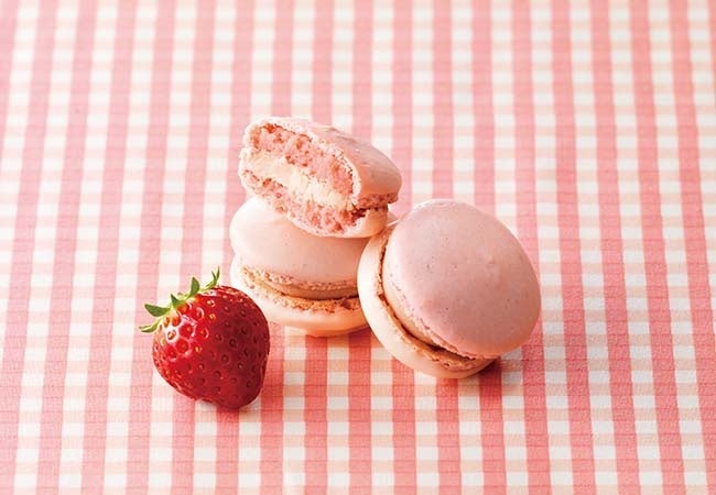 ストロベリー風味のマカロン生地に、ストロベリーにチーズの味わいを加えたクリームをサンド。片面にはホワイトチョコレートをコーティング。ストロベリーとチーズの風味が甘くさわやかに香る、甘酸っぱい春を感じるマカロンです。