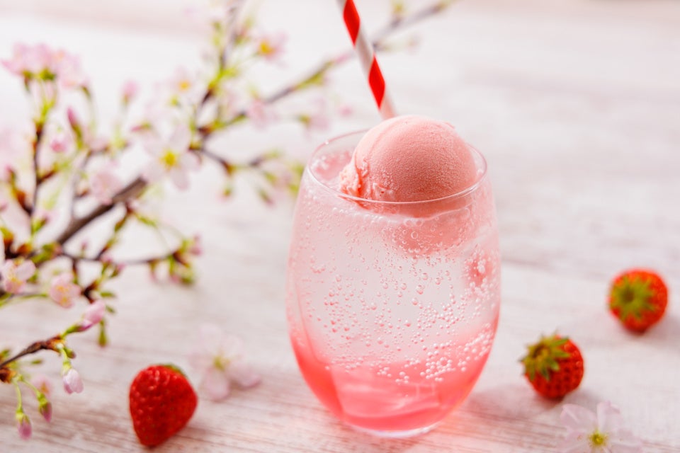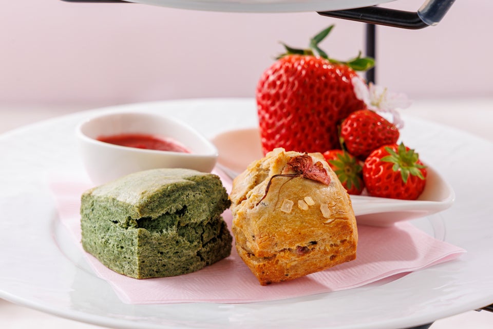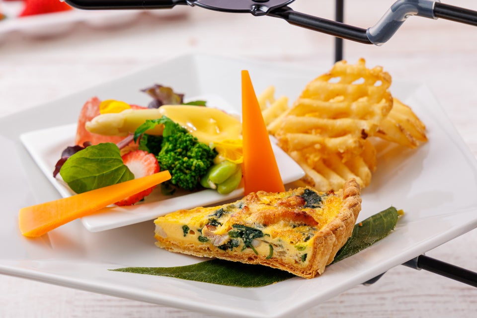 春野菜と苺、ミモレットチーズを添えた“サラダ”や桜で燻製した自家製ベーコンとほうれん草の“キッシュロレーヌ”など春を感じられるセイボリー。“桜と苺のクリームソーダ”のウェルカムドリンクも合わせてご堪能いただけます。