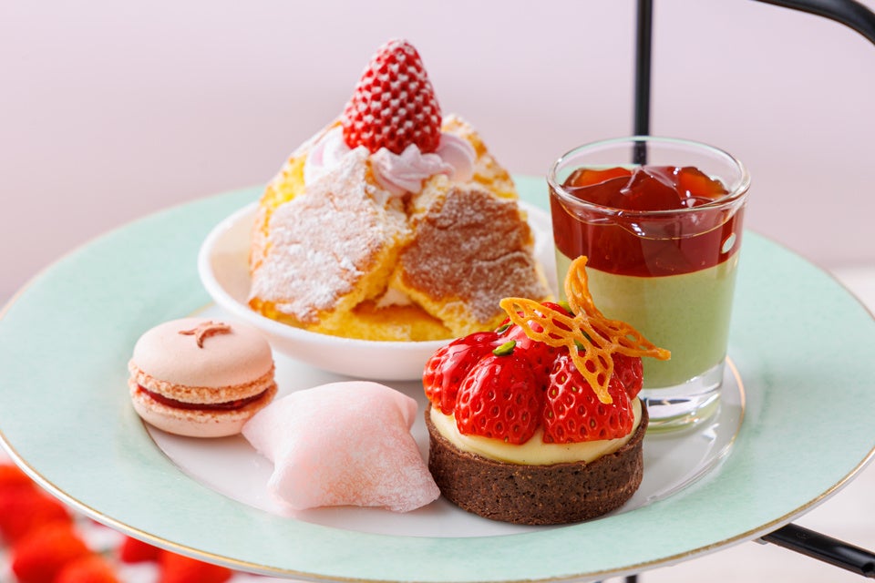 スイーツには満開の桜の木をイメージし、桜のクリームにふわふわのスポンジ生地をはりつけた“苺のショートケーキ”や桜薫るショコラに苺がたっぷりのった“タルト”、抹茶のパンナコッタと桜の紅茶ジュレの2層のハーモニーが楽しめる“ヴェリーヌ”などをご用意。また一口では食べきれない特大サイズの“紅ほっぺプレミアム苺”もお楽しみいただけます。