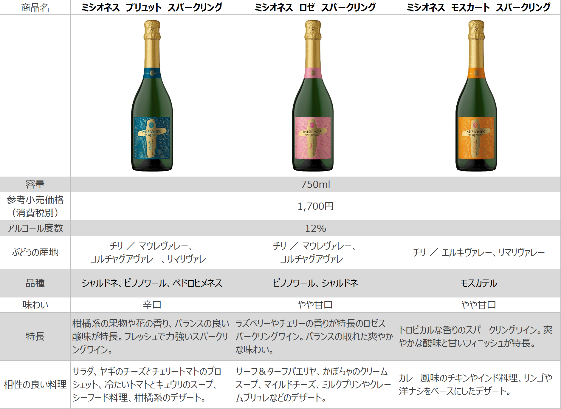 「ミシオネス デ レンゴ スパークリング」は厳選されたぶどうを使用したプレミアムスパークリングワイン。発売する3種はそれぞれ味わいに特長があり、食事に合わせてお楽しみいただけます。ブリュットはバランスの取れた酸味が特長のフレッシュで力強いスパークリングワイン。ロゼは爽やかな味わいでバランスよく、飲み心地の良い味わいです。モスカートは爽やかな酸味と甘いフィニッシュが特長。