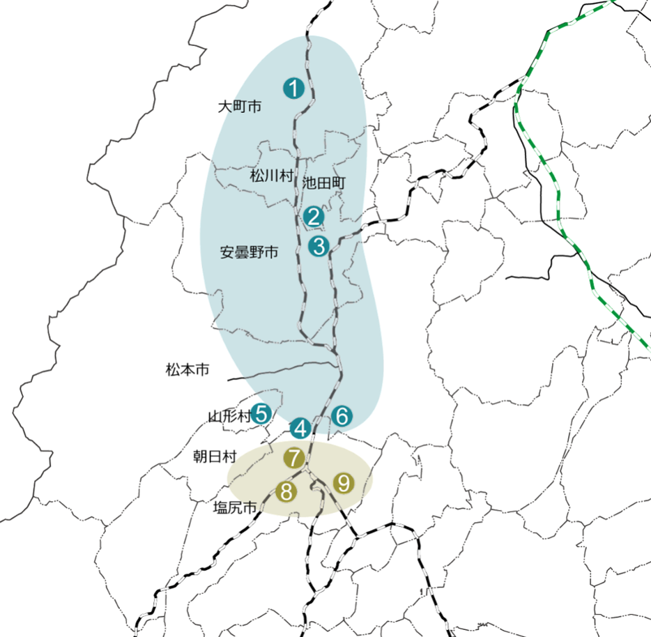 松本市から、安曇野、大町市にかけて北アルプスを展望するように広がるエリア。長野県ぶどう栽培の発祥の地があり、古くからぶどう栽培が盛んな地域です。 盆地の東斜面と西斜面にぶどう畑が広がり、冷涼な気候で日照時間が長く、現在では欧州系ぶどうから赤ワイン・白ワインが共に生産されています。
