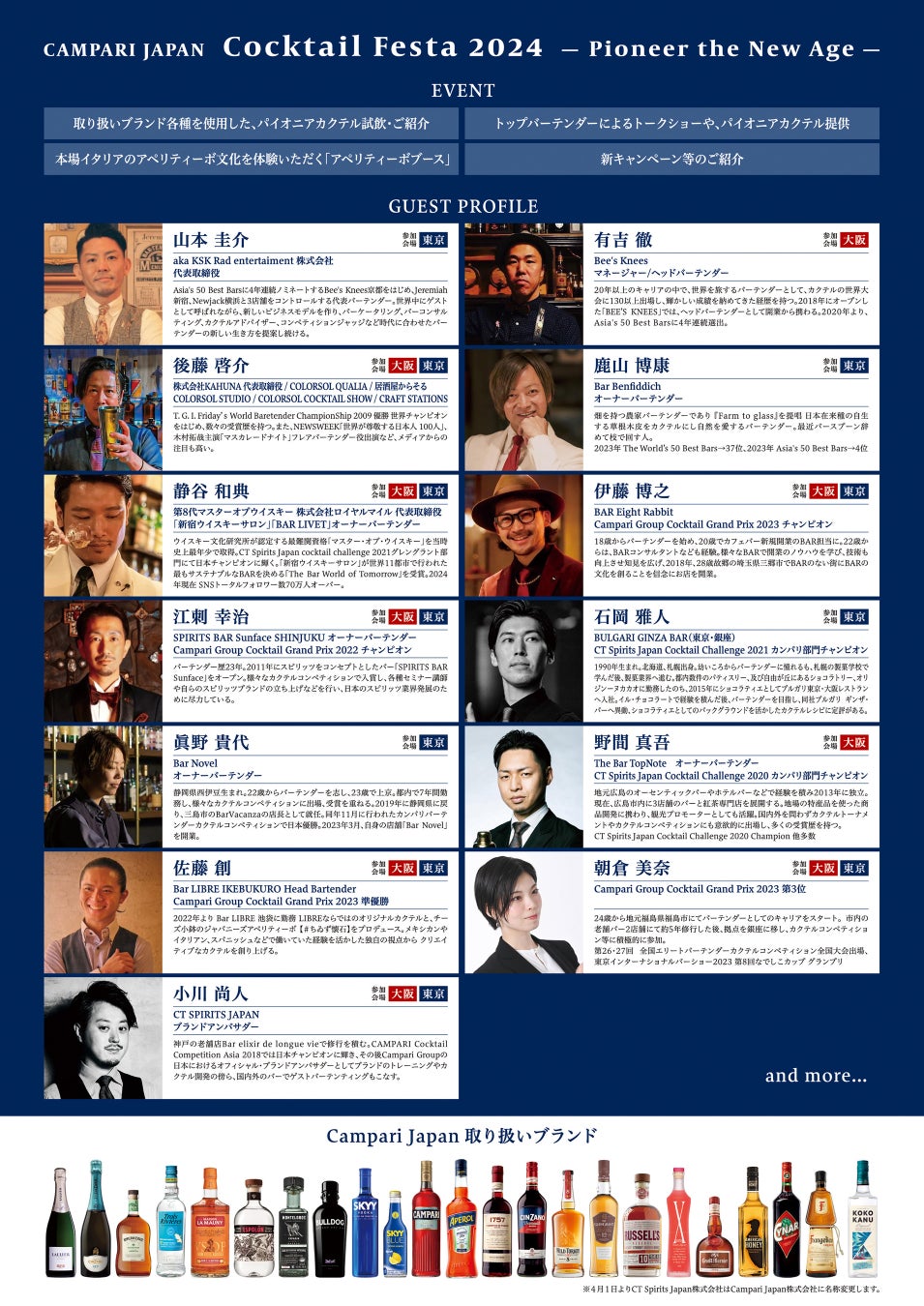 本年は、カンパリグループ本社があるイタリアには欠かせない「アペリティーボ」文化の浸透、そしてカクテルの新時代を切り拓く「パイオニアカクテル」の創作を目的とした「アペリティーボ&パイオニア」をテーマに、今最も注目されているバーテンダーのトークショーやカクテル提供*など、魅力的なコンテンツを多数ご用意しています。
