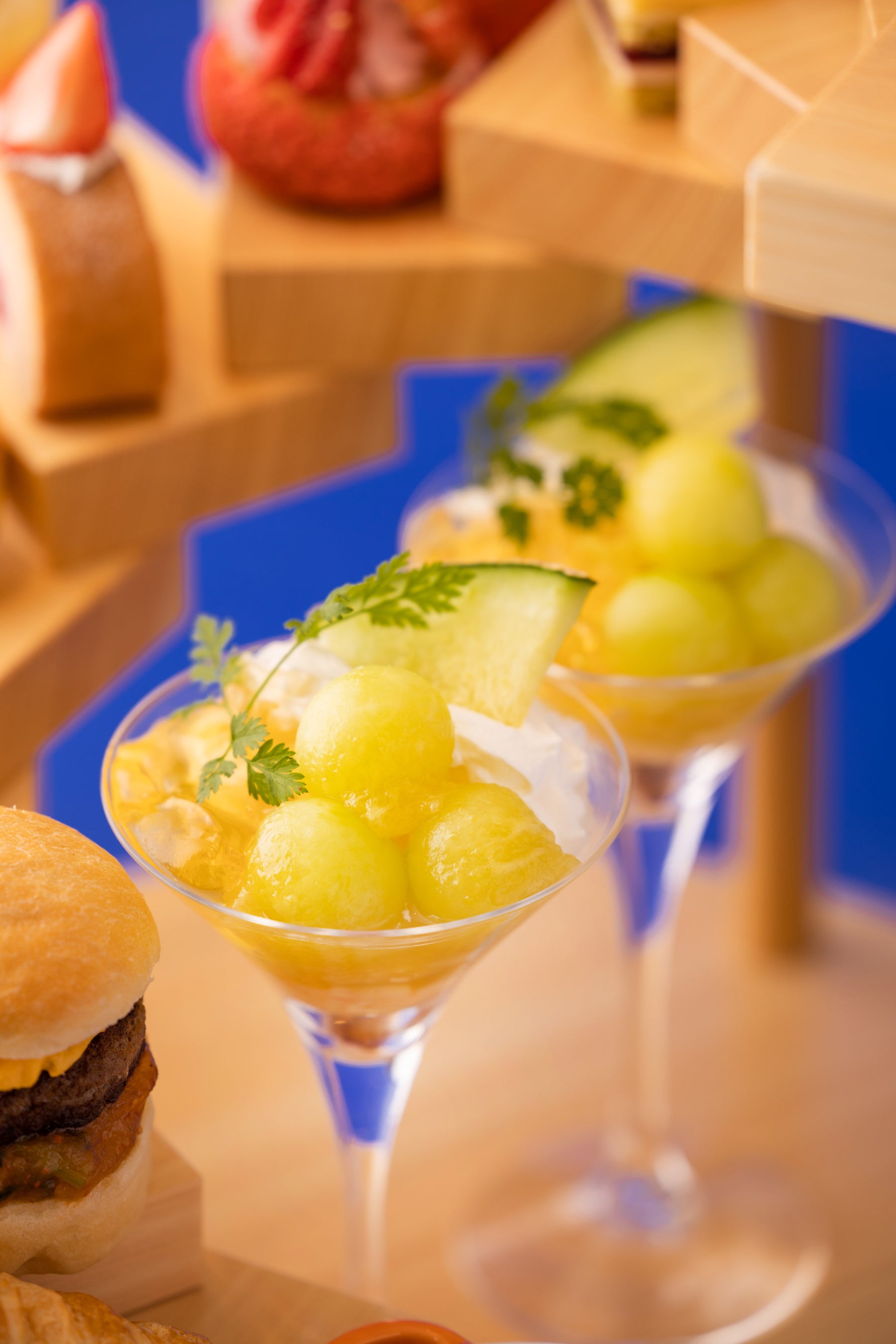 メロンリキュールをしみ込ませたスポンジ生地にリキュールでマリネしたメロンの果肉ボール、あっさりマスカルポーネクリームとカスタードクリームを絞った「宮崎県産メロンのパルフェ」