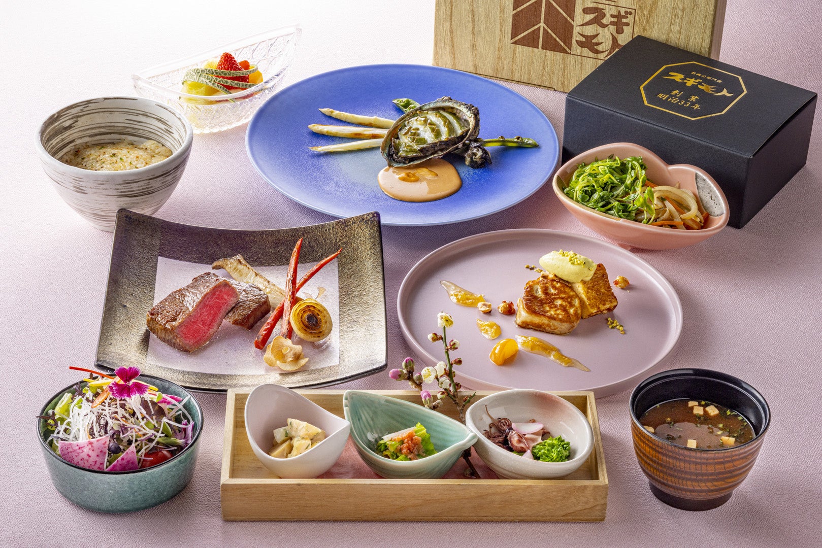 鉄板焼きコーナーでは、厳選国産黒毛和牛と飼料や育て方にこだわった「ヘルシークイーン(再肥育牛)」のスペシャル食べ比べコースや春の味覚を織り交ぜた魚介料理とお肉の「スギモト」厳選国産牛をお楽しみいただいたけるコースなど全8種類のコラボレーションメニューをご用意。会席では、国産牛のしゃぶしゃぶをメインに春の旬の食材をふんだんに使用したメニューをお楽しみいただけます。