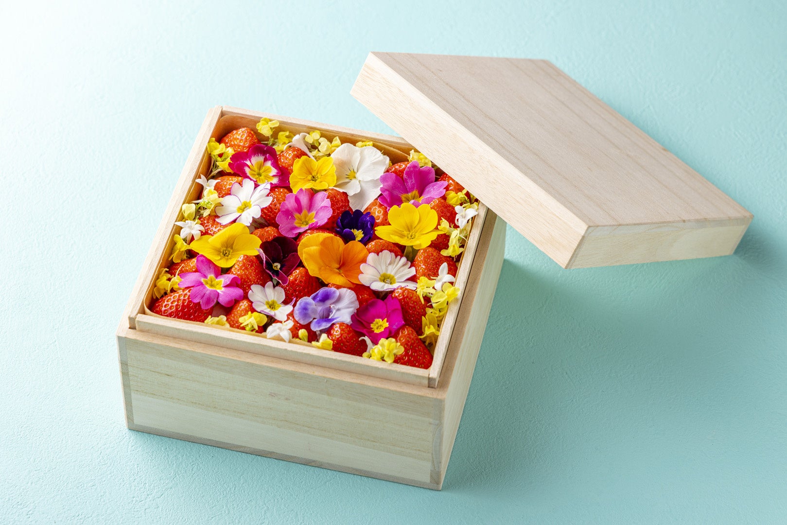 マスカルポーネチーズのコクとコーヒーのほろ苦さが味わい深いホテルメイドのティラミスに、イチゴと色とりどりのエディブルフラワーで華やかにデコレーションしたストロベリーティラミスを開業35周年記念桐箱にてご提供いたします。