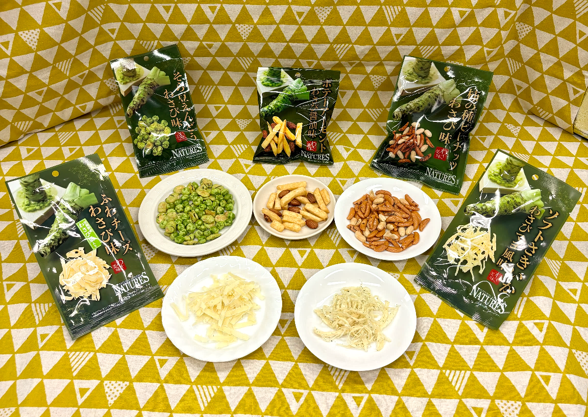 柿の種やさきいかなど、定番のおつまみがわさび味になって登場。期間限定商品です。わさびの辛みと風味を楽しむことができ、暑い季節のビールとも相性抜群。ツーンとした刺激がクセになりついつい食べる手が止まらない味わいに仕上げました。