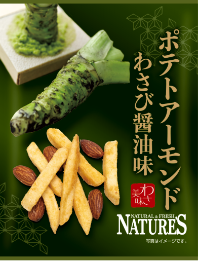 商品特徴:わさび醤油シーズニングで味付けしたサクッと食感のポテトとアーモンドのミックスです