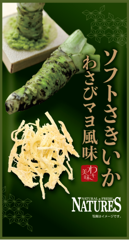 商品特徴:イカの胴部分を焙焼して裂き、わさびマヨ風味で味付け柔らかい食感に仕上げました