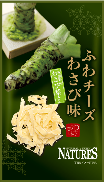 商品特徴:薄く削ったチーズに安雲野産乾燥わさび葉を使用したシーズニングで味付けしました