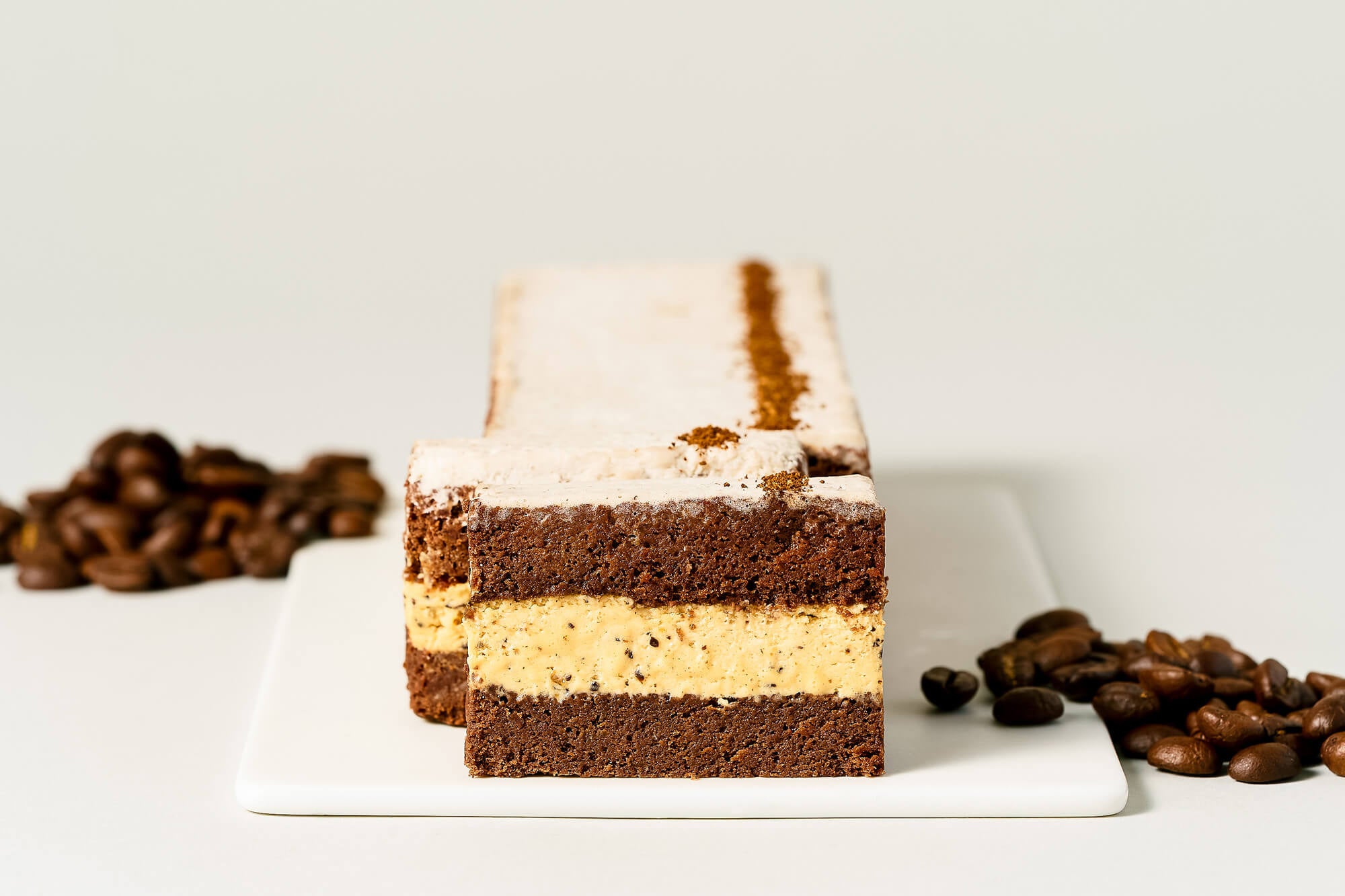 中央のクリームに、「REC COFFEE」のエチオピア産コーヒー豆を用いました。ドリップして抽出すると、立体感のある酸に紅茶やミックスベリーのようなフレーバー、そしてほのかに感じるレモングラスの風味を持っています。このコーヒー豆を挽いて粉状にし、中央のカラメルクリームの層にそのまま用いているため、コーヒーの香りをダイレクトに感じていただけます。