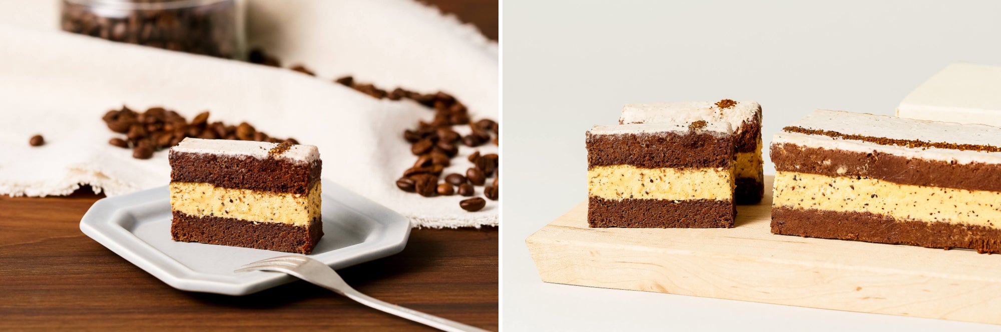 香り高いコーヒーに合わせて、しっとりとした食感の生ガトーショコラ生地には、草花のような華やかな香りをもつ「SAVORY」というフレーバーと、カカオ由来のナッツのようなフレーバーの「NUTTY」の2種のチョコレートをブレンドして用いました。さらに上部には、コーヒーとチョコレートどちらとも相性の良いブルーベリーピューレを用いた生クリームを薄くあしらっています。