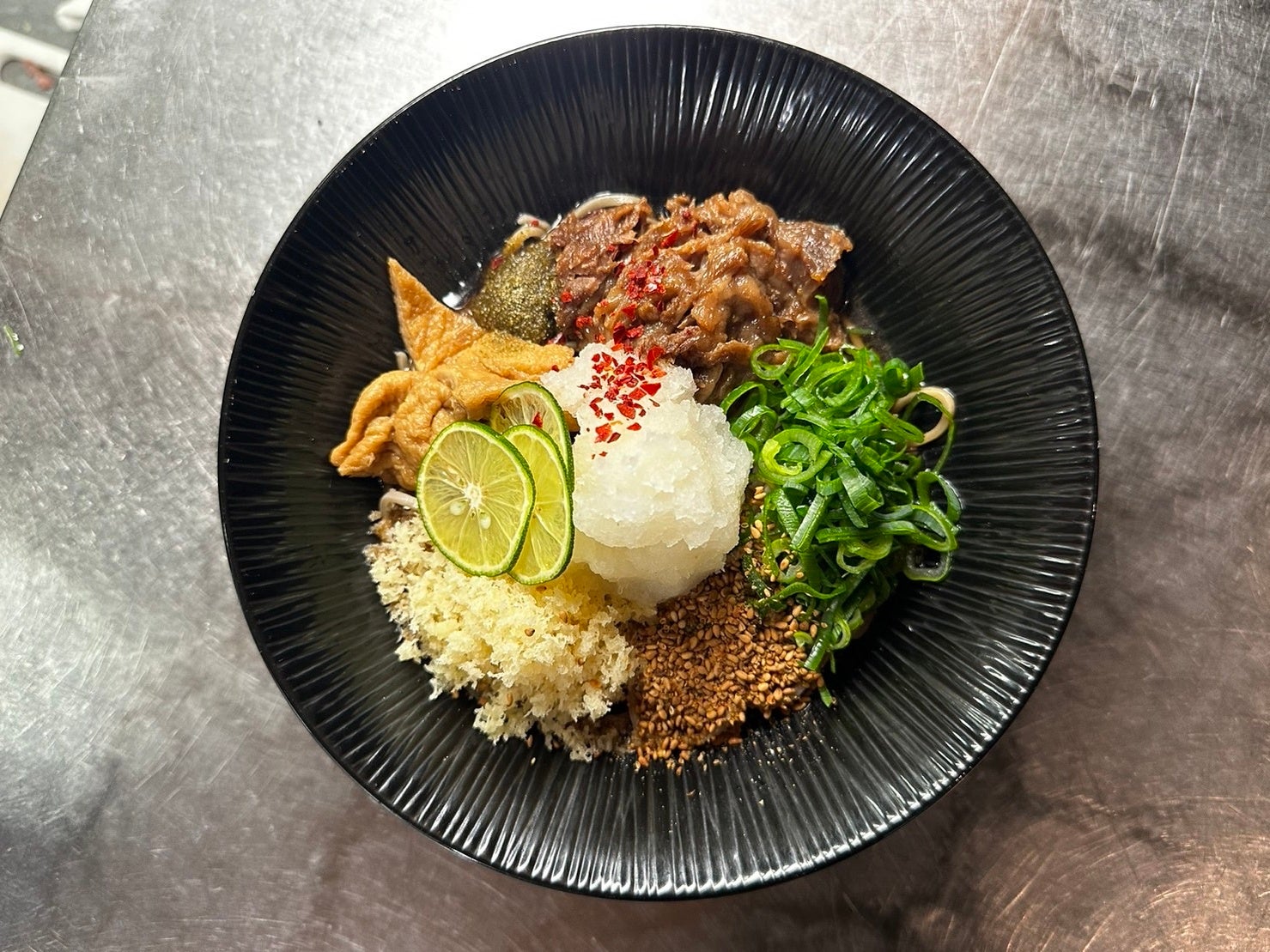 甘辛いつゆと揚げ、天かすを混ぜながら食べる冷やしたぬきそばと、濃厚な和牛の旨み、そしてすだちの爽やかな香りがたまらなく食欲をそそる今回の新商品。