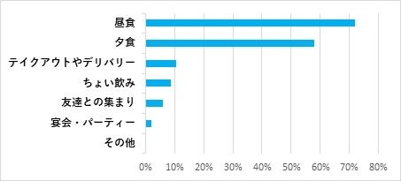 普段、中華料理チェーン店を利用する頻度をたずねたところ、週1回以上のヘビーユーザーが2.8%、月1~3回以上の21.0%も合わせて23.8%。およそ4人に1人が、月1回以上中華料理チェーン店を利用していると回答。私たちの食生活にとって身近な存在であることが分かります。家族と、昼食や夕食で、というのが主要な利用シーンですが、一方で、1人や友達同士で利用する人も一定数存在。ファミリーの利用しやすい店づくりやサービスの充実と同時に、ちょい飲みや1人利用、さらにはテイクアウトやデリバリーなど、多様なニーズへの対応も求められていると言えそうです。